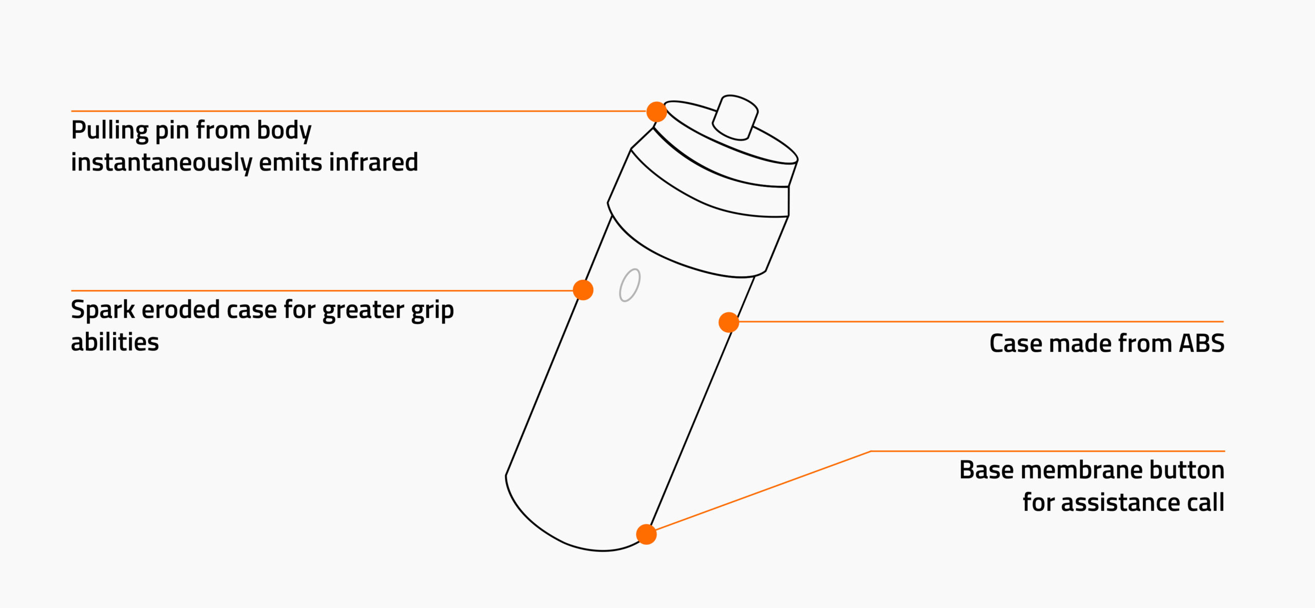 When the PIT has been pulled from its retaining pin in an emergency situation, infrared light is immediately spread upwards towards the receiver unit in the room. Therefore there is no need to point the PIT directly at the receiver units for the alarm to trigger.
